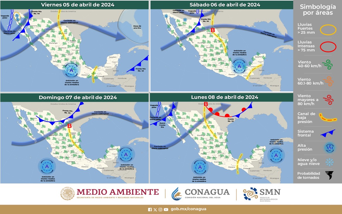 Hay que señalar que durante este fin de semana de abril también estará presente un canal de baja presión sobre el sureste mexicano por lo que se pronostican precipitaciones en estados como Chiapas, Oaxaca, Veracruz, Tabasco, Campeche, Yucatán y Quintana Roo.