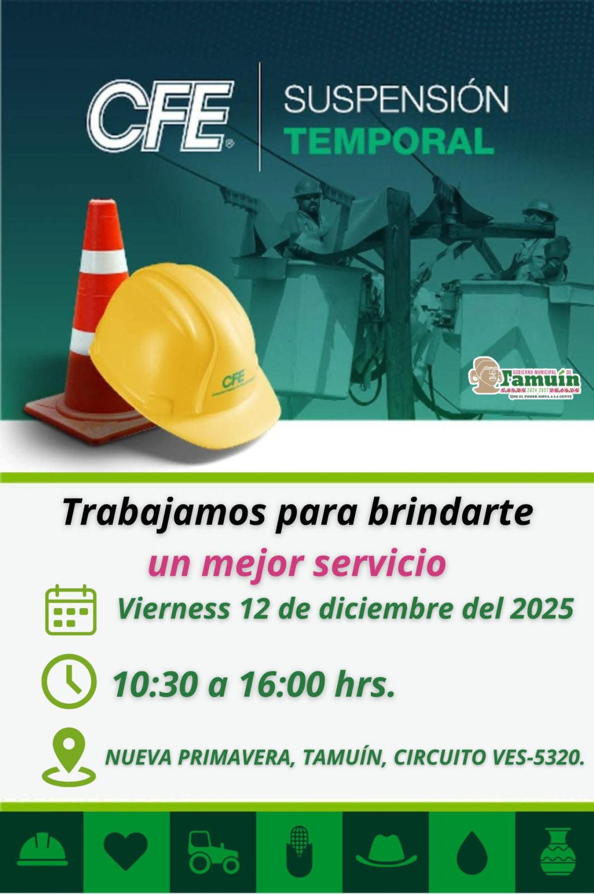 Con el objetivo de fortalecer la infraestructura eléctrica y garantizar un mejor servicio, la CFE anunció que hoy 12 de diciembre estará realizando trabajos de mantenimiento que provocarán la suspensión del suministro eléctrico en el municipio de Tamuín, San Luis Potosí. Es importante destacar que este corte solo aplicará en dicha zona, y por el momento no se ha reportado afectación en otras colonias o localidades cercanas.