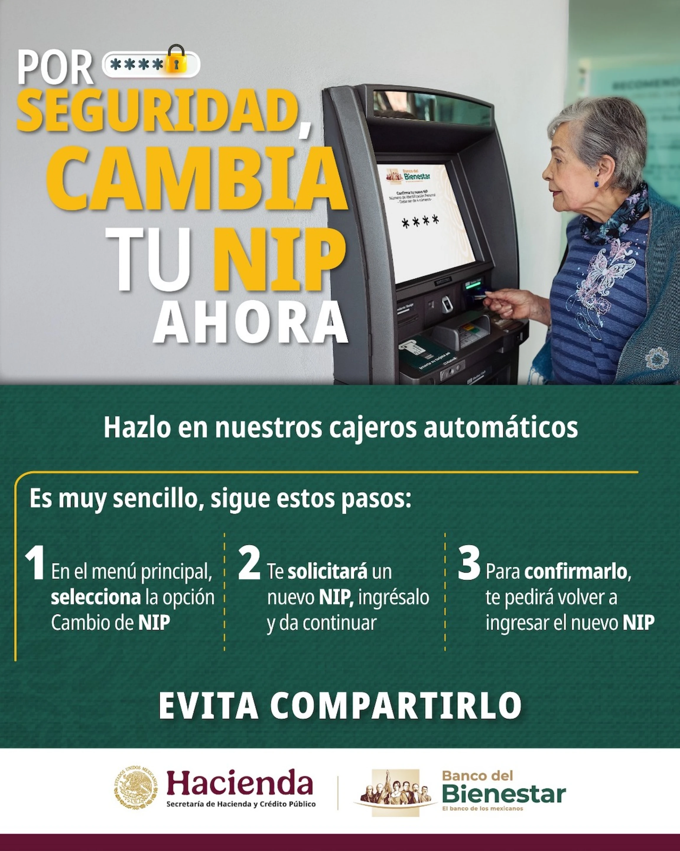 Al momento del trámite para cambiar el NIP de la tarjeta del Banco del Bienestar, a los adultos mayores se les recomienda que los cuatro números de la contraseña sean fáciles de recordar, pero se debe evitar usar datos como la fecha de nacimiento o números consecutivos. Asimismo, se recalca que dicha información no debe ser compartida con extraños para así proteger mejor su dinero y no ser víctimas de fraudes.